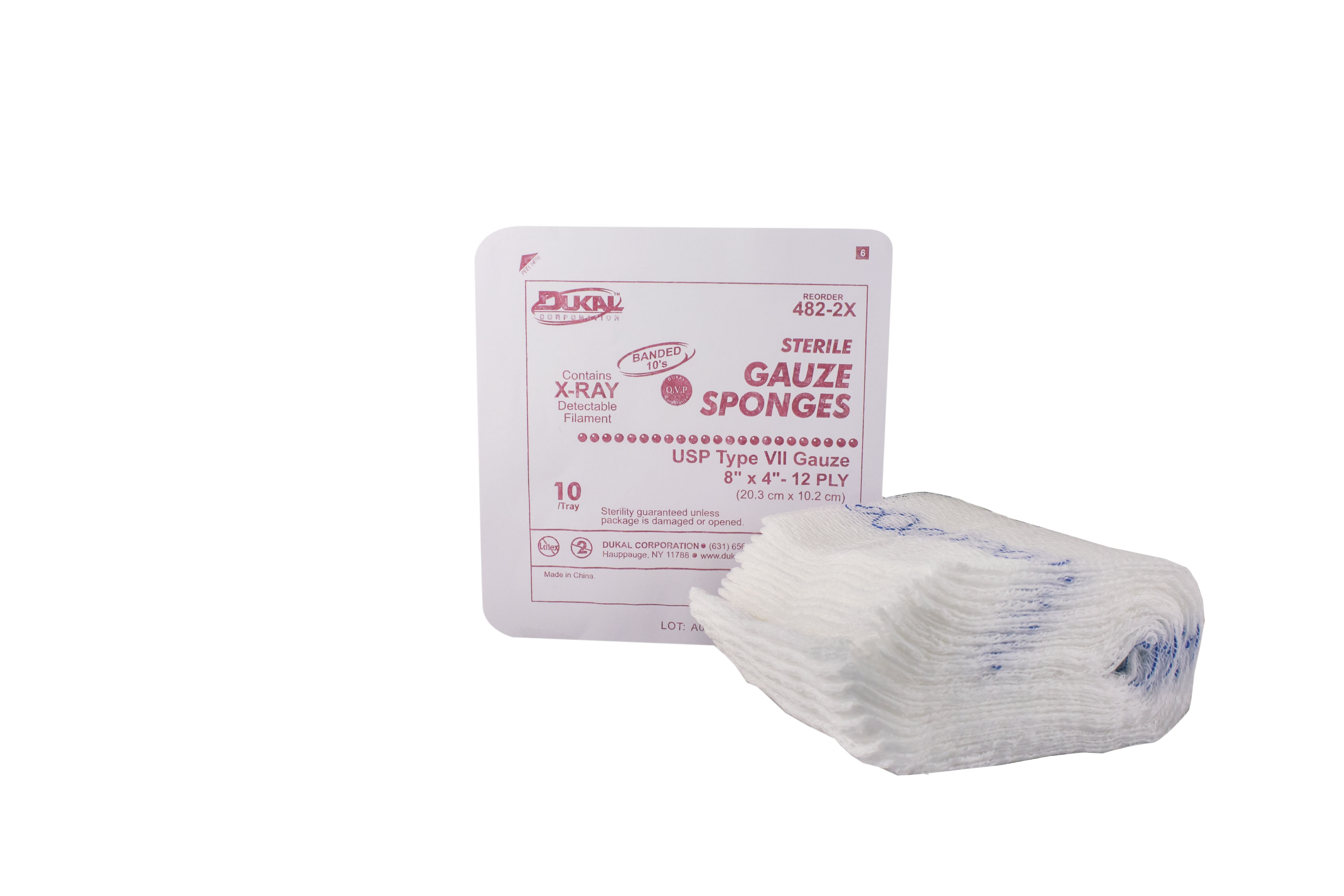Sterile, Gauze, X-Ray Detectable, 8" x 4", 12-ply. USP Type VII gauze, 100% woven-cotton, Blue filament runs through each sponge and has a unique wave pattern to ensure easy x-ray detection, Sterile sponges are packaged in rigid plastic tray with peel back lid, Both sterile and non-sterile sponges are banded in 10’s to ensure accurate count. 10/ty, 48 ty/cs