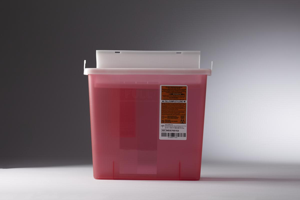 The torturous lid design facilitates one-handed disposal; Horizontal drop design for maximum capacity to fill line; Each container locks for final disposal; Nestable containers save space and help reduce shipping costs; Easy-to-see fill levels; Available in wall mount and freestand designs with multiple bracket and cabinet options. 1EA, 20EA/CS